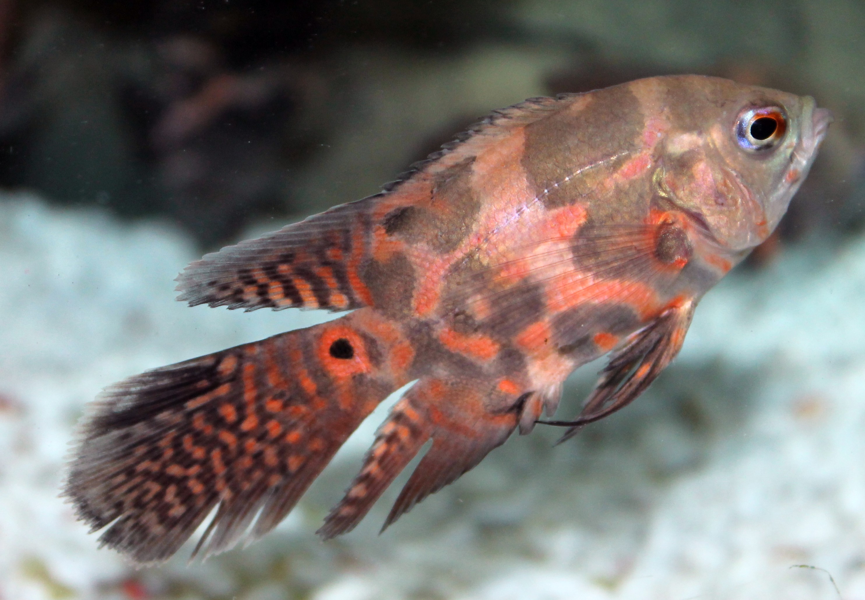 Description- Oscars are a South American cichlid found in the water of the Amazon Basin. In the early 1800's Oscars were given the Latin name Lobotes ocellatus, but this has been updated to Astronotus ocellatus, a hopefully more accurate name.  Oscars are fairly large fish, typically reaching lengths between twelve and sixteen inches. These fish generally live for eight to twelve years, depending on the quality of care given.